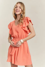 This romper features charming ruffle sleeves and convenient pockets. The combination of style and functionality makes it a versatile piece for any occasion. Stay comfortable and stylish with this cute ruffle sleeves romper.