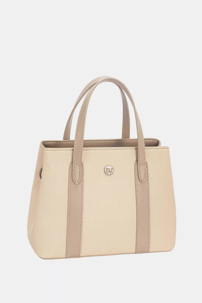 This elegant two-tone handbag combines durable canvas material with sophisticated leather trim accents. Features a structured tote design with dual handles, spacious interior perfect for daily essentials, and a timeless beige and taupe color palette. The metal logo medallion adds a premium touch while reinforced leather edges ensure long-lasting durability. Ideal for professional settings, casual outings, or everyday use with its versatile styling and practical functionality.