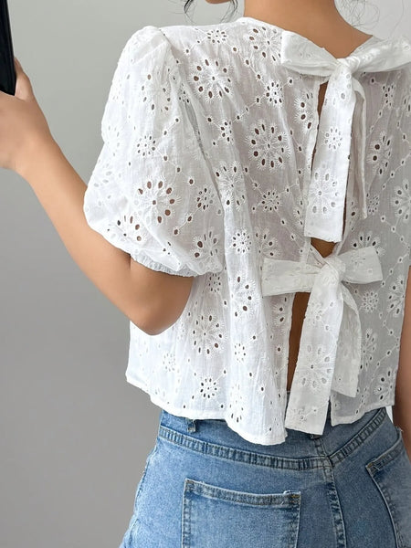 Eyelet Embroidered Puff Sleeve Tie-Back Blouse