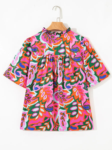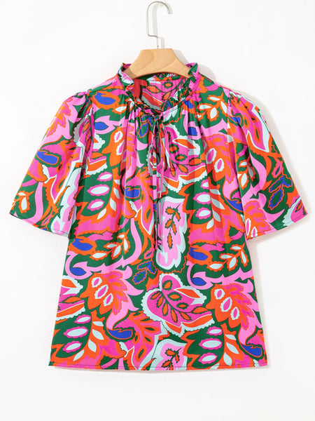 Tropical Print Short Sleeve Tie Neck Blouse