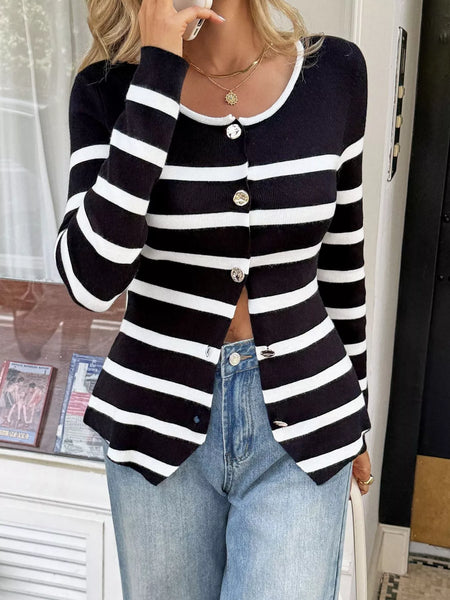 This striped button-up knit cardigan blends cozy comfort with a fresh, on-trend look perfect for layering up your everyday outfits.