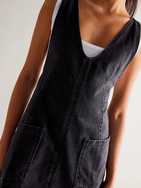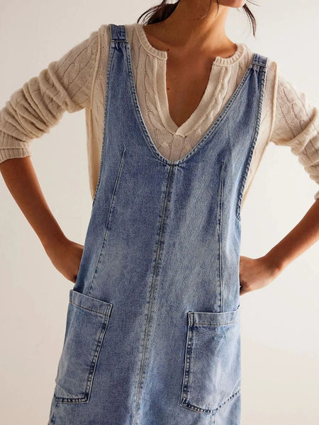 Oversized V-Neck Denim Tank Dress with Front Pockets