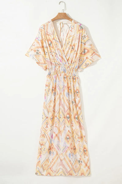 Printed Half Sleeve Shirred High Waist Maxi Dress