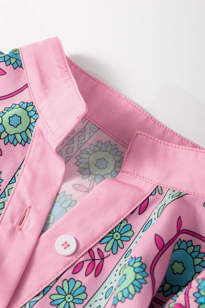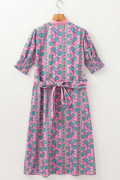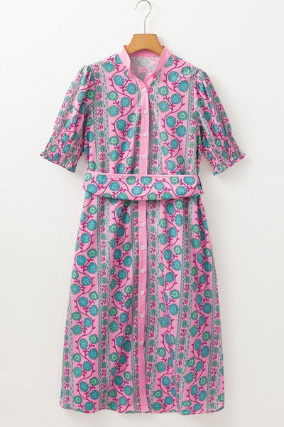 Printed Shirred Sleeve Buttoned Front Midi Dress with Sash