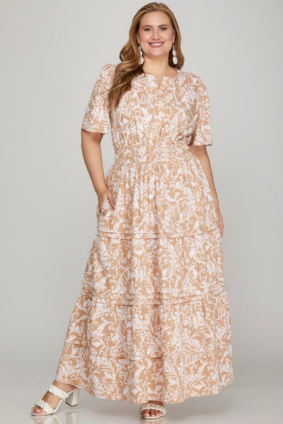 She + Sky Printed Notched Woven Tiered Pintuck Maxi Dress with Side Pockets
