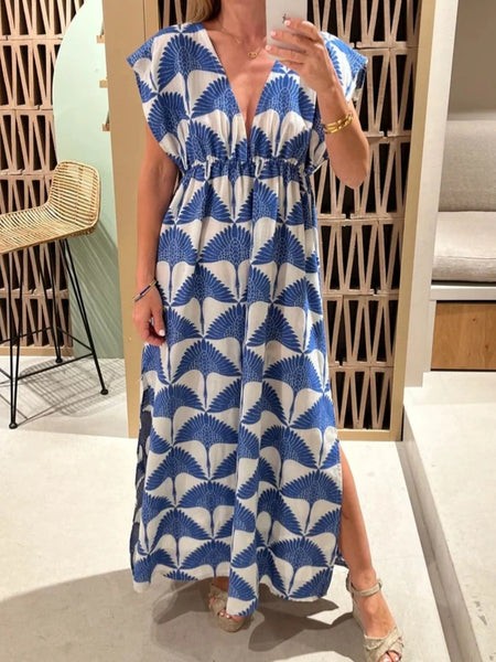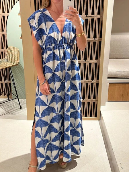 Slit Printed V-Neck Cap Sleeve Maxi Dress