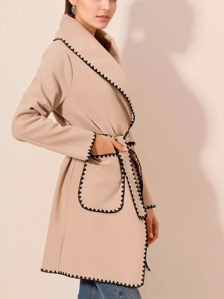 This sophisticated contrast trim tie waist outerwear features premium fabric construction with eye-catching black zigzag decorative stitching along all edges. The wrap-style design includes a self-tie waist belt for a flattering silhouette and adjustable fit. Crafted with long sleeves and a classic lapel collar, this midi-length coat offers versatile styling options. The distinctive contrast trim detailing adds visual interest while functional patch pockets provide practical storage. Perfect for transitional weather, this statement outerwear piece combines comfort with fashion-forward design elements.