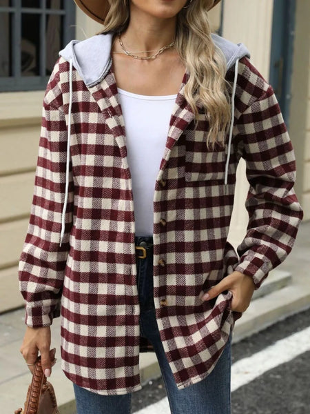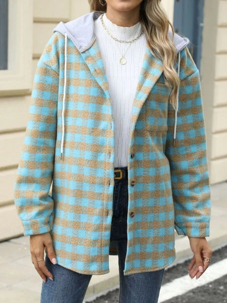 Plaid Button Up Long Sleeve Drawstring Hooded Jacket