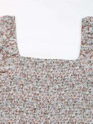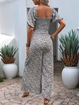 Perfee Ditsy Floral Smocked Square Neck Puff Sleeve Jumpsuit