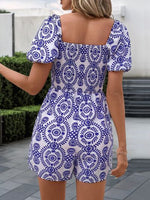 Perfee Printed Smocked Square Neck Puff Sleeve Romper