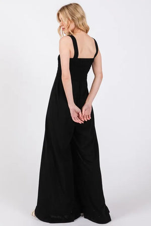 A smocked flowy wide leg jumpsuit is a fashionable and comfortable one-piece outfit. The smocked bodice offers a stretchy and fitted silhouette, while the flowy wide legs provide a relaxed and breezy feel. This jumpsuit is perfect for a stylish and effortless look, ideal for various occasions from casual outings to semi-formal events.