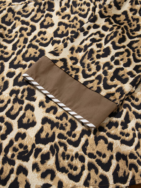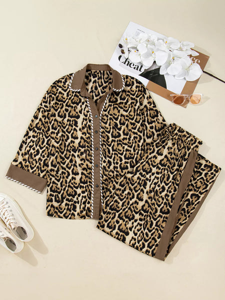 Leopard Collared 3/4 Sleeve Shirt and Loose Pants Two Piece Outfit Set