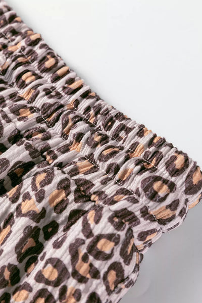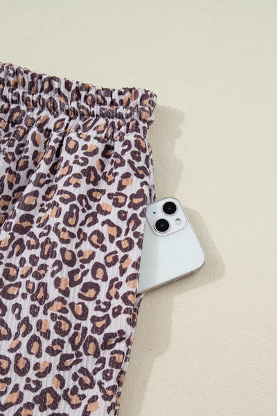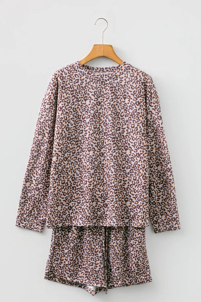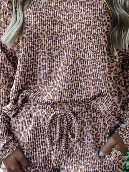 Leopard Ribbed Long Sleeve Top Drawstring Shorts 2pcs Outfit