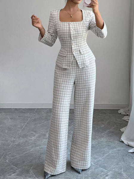 This plaid square neck button-up top and pants set brings a retro-inspired, coordinated look with a modern twist, perfect for layering or styling with ease for a chic, put-together ensemble.