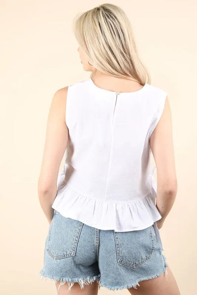 The Side Tie Detail Ruffled Sleeveless Top is a chic and versatile piece that combines feminine details with a modern style. This top features ruffled sleeves and a side tie detail, adding a touch of elegance and flair. The sleeveless design makes it perfect for warm weather, and the side tie detail adds a unique and stylish element to the top. Pair it with jeans or a skirt for a casual and fashionable look that can easily transition from day to night.
