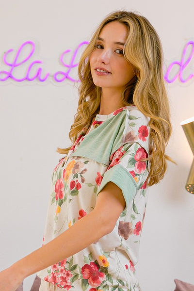 BiBi Floral Button Detail Round Neck Short Sleeve Terry T-Shirt