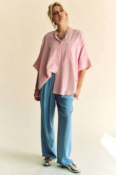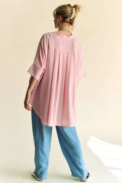 Davi & Dani Rhinestone Pleat Back Short Sleeve Loose Fit Shirt