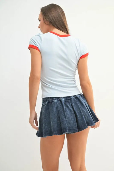 The Contrast Trim Fitted Baby Tee is a stylish and flattering option for a casual yet trendy look. Its contrast trim detailing adds a chic touch to the classic baby tee style. The fitted silhouette enhances your figure while providing a comfortable fit. Perfect for pairing with high-waisted jeans or a skirt, this tee is versatile and easy to style. Whether you're running errands or meeting friends for coffee, the Contrast Trim Fitted Baby Tee is a versatile piece that can be dressed up or down with ease. Stay effortlessly cool and on-trend with this must-have wardrobe staple.