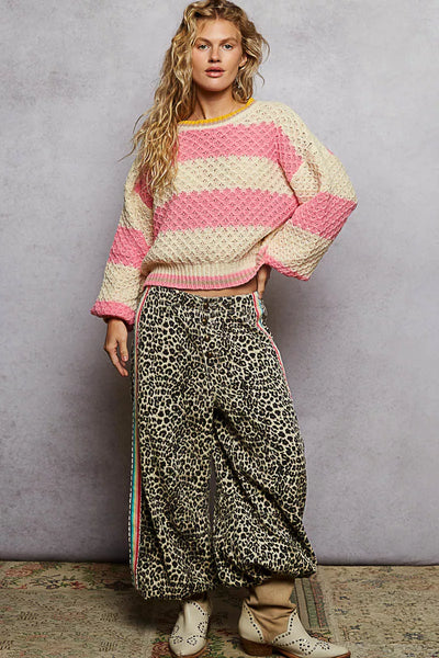 Make a statement with this contrast striped round neck sweater featuring a textured cable knit pattern. The bold stripes add a modern twist to the classic cable knit design. The round neck offers a versatile and timeless silhouette. Perfect for adding a pop of color and texture to your winter wardrobe. Stay cozy and stylish with this on-trend sweater that combines classic and contemporary elements.