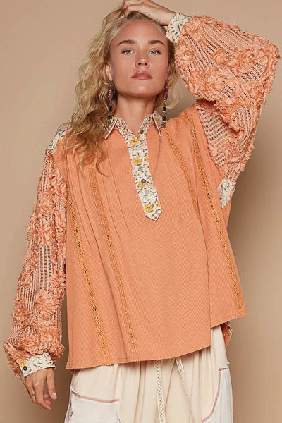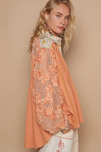 This stunning bohemian-inspired blouse features a luxurious textured knit construction with eye-catching cable knit sleeves in a warm coral orange hue. The standout design element includes contrasting floral print collar and cuffs that add feminine charm and visual interest. Made from soft, comfortable knit fabric blend that provides warmth and comfort. The oversized silhouette offers a relaxed, effortless fit perfect for casual styling. Unique mixed-texture design combines smooth ribbed body with chunky cable knit sleeves for dimensional appeal. Versatile piece that transitions easily from casual daywear to elevated bohemian looks. Quality construction ensures durability while maintaining soft hand feel. Perfect for layering or wearing as a statement piece.
