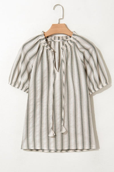 Stripe Frilled Tie Neck Short Sleeve Blouse