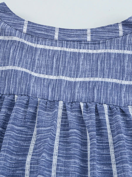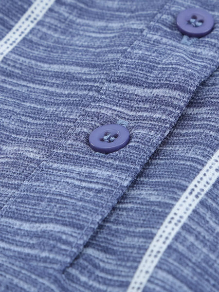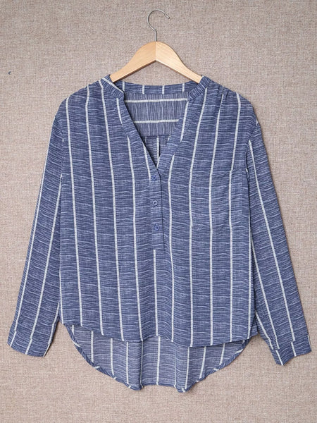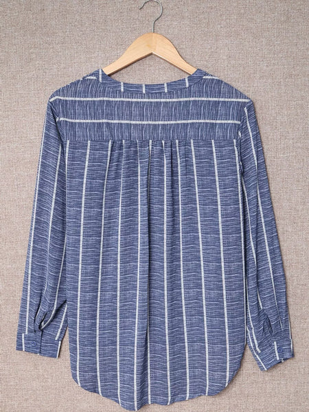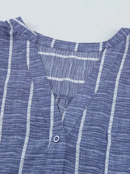 This striped v-neck blouse with half buttons offers a relaxed yet refined look, perfect for adding subtle flair to any casual or semi-formal outfit.