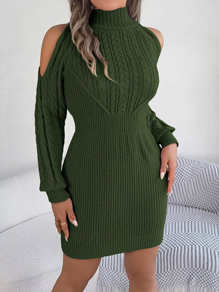 Cold Shoulder Cable Knit Turtleneck Sweater Dress