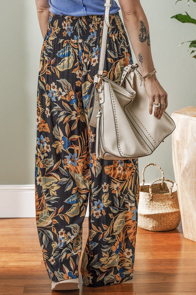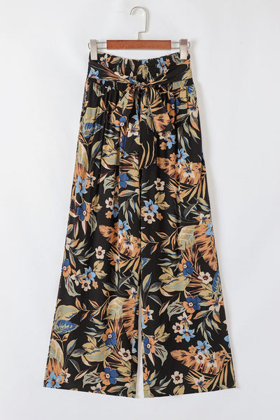 Floral Shirred High Waist Wide Leg Pants with Tie