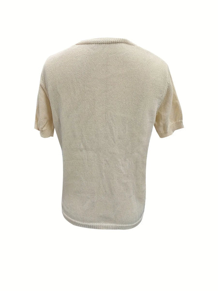 This stunning embroidered floral V-neck sweater combines comfort and artistry in one beautiful piece. Crafted from soft knit fabric in a classic cream tone, it features an eye-catching array of hand-embroidered floral motifs in vibrant hues of orange, blue, burgundy, and forest green. The flattering V-neckline is enhanced with delicate lace-up detailing, while the short sleeves make it perfect for layering or wearing alone. The folk art inspired botanical embroidery creates a vintage bohemian vibe that's both timeless and on-trend. Made from comfortable knit material that drapes beautifully, this pullover sweater offers a relaxed fit that flatters all body types. Perfect for casual outings, weekend brunches, or adding artistic flair to your everyday wardrobe.