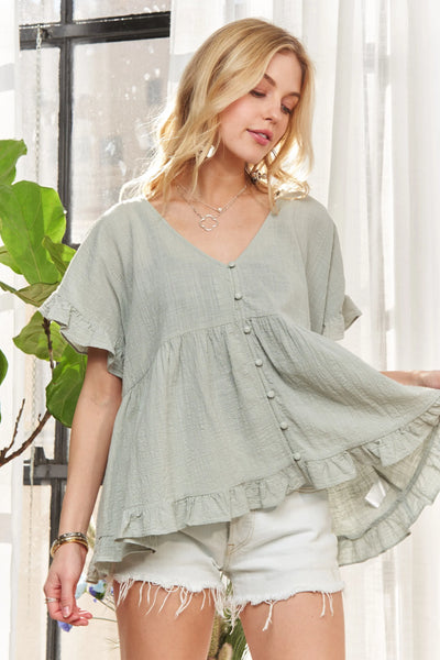 The Button Down Ruffled Babydoll Blouse is a feminine and charming top with ruffle details and a button-down front for a stylish look. This blouse combines a classic babydoll silhouette with elegant ruffles, creating a romantic and flattering fit. Perfect for adding a touch of sweetness and sophistication to your outfit, this blouse is versatile for both casual and more dressed-up occasions.