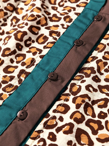 Leopard Print Contrast Frilled Trim Button Down V Neck Shirt