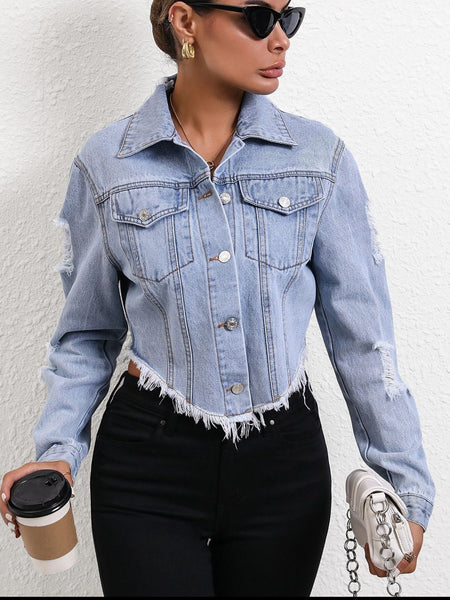 Distressed Raw Hem Button Up Denim Jacket
