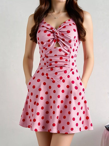 This polka dot halter neck dress with a twisted front adds a playful yet sophisticated edge to any outfit, blending charm and modern flair effortlessly.
