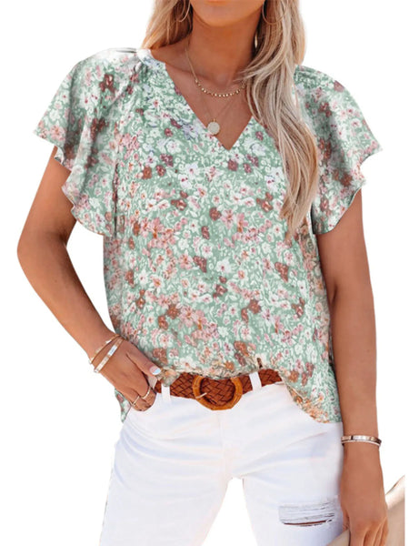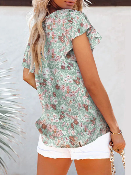 Full Size Flutter Sleeve Floral V-Neck Blouse