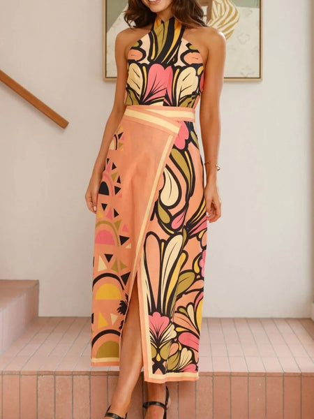 Printed Halter Neck Crop Top and Skirt Set