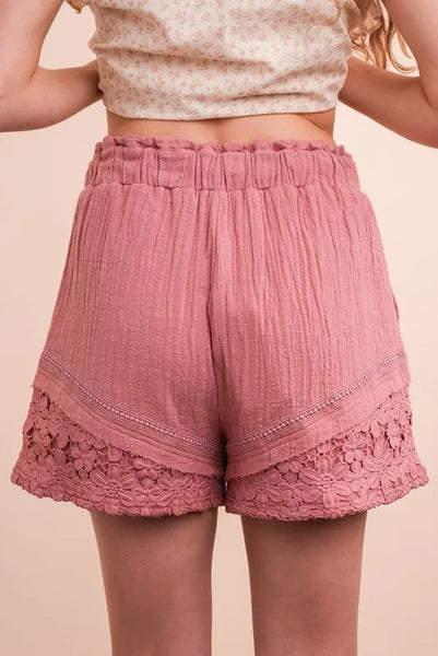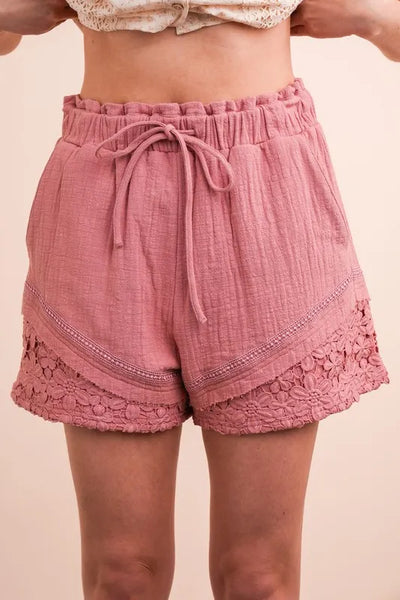 Lace contrast detail woven shorts are chic and stylish bottoms that feature delicate lace accents. These shorts combine a woven fabric with lace detailing for a feminine and elegant look. The lace adds a touch of sophistication and texture to the shorts, making them perfect for both casual and dressed-up occasions. Pair these shorts with a tucked-in blouse or a simple top for a fashionable and trendy ensemble.