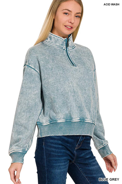 Stay cozy and stylish in the Acid Wash Fleece Half Zip Sweatshirt, featuring a trendy acid wash design for a unique and edgy look. The half zip closure adds a sporty touch and allows for easy layering and temperature control. Crafted from fleece material, this sweatshirt is soft and comfortable for all-day wear. Perfect for adding a cool and casual vibe to your outfits, this sweatshirt is a versatile piece for your wardrobe. Whether you're lounging at home or running errands, the Acid Wash Fleece Half Zip Sweatshirt is sure to keep you comfortable and on-trend.