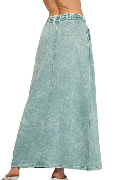 This stunning vintage-washed denim maxi skirt features a fashion acid wash finish in a beautiful sage green tone. Crafted from premium quality denim fabric, it offers both comfort and style with its elastic waistband and adjustable drawstring closure. The eye-catching front slit adds a modern touch while ensuring ease of movement. The ankle-length design creates an elegant silhouette that's perfect for various occasions, from casual outings to semi-formal events. The relaxed fit flatters all body types, making it a versatile wardrobe essential.