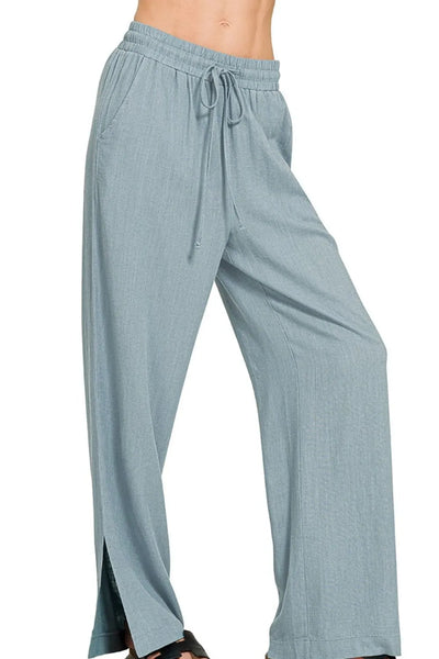 These contemporary wide leg pants feature a sophisticated dusty blue hue in a lightweight ribbed fabric that offers both comfort and style. The elastic waistband with functional drawstring ensures a perfect fit, while the relaxed wide leg silhouette provides unrestricted movement. Crafted from a soft polyester-spandex blend, these pants feature distinctive side slits at the hem for added breathability and modern flair. Perfect for loungewear, yoga sessions, or elevated casual wear, these versatile pants combine the comfort of athletic wear with the elegance of contemporary fashion.