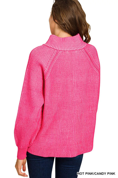 Stay cozy and stylish in this ribbed two-tone half zip sweater. The unique two-tone design adds a modern twist to the classic ribbed knit construction. Featuring a half zip closure, this sweater offers versatility in styling and temperature control. The ribbed texture adds depth and interest to the look, while providing a snug and comfortable fit. Perfect for layering or wearing on its own, this sweater is a versatile piece that can be dressed up or down for any occasion. Elevate your cold-weather wardrobe with this chic and on-trend ribbed two-tone half zip sweater.