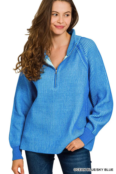 Zenana Ribbed Two Tone Half Zip Sweater