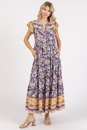 The Floral Ruffled Notched Cap Sleeve Maxi Dress is a charming and feminine garment that exudes Bohemian chic style. The notched cap sleeves add a unique touch to the dress, while the floral print provides a romantic and whimsical feel. The ruffled detailing enhances the overall elegance of the dress, making it perfect for various occasions such as beach outings or summer weddings. Pair this maxi dress with sandals and minimal accessories for a relaxed yet stylish look.