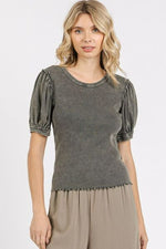 This rib knit top features a unique mineral wash finish with puff sleeves and lettuce edge detailing for a stylish and trendy look. The mineral wash adds a cool and edgy vintage touch to the ribbed fabric, giving it a worn-in appearance. The puff sleeves add a feminine and fashion-forward element, while the lettuce edge trim provides a textured and playful finish. Perfect for adding a touch of character to your outfit, this top is versatile and chic. Pair it with high-waisted jeans or a skirt for a fashion statement that stands out. Elevate your style with this mineral wash puff sleeve lettuce edge rib knit top!