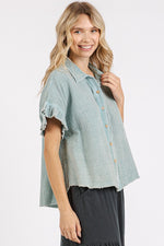 The Mineral Washed Button Down Flounce Sleeve Shirt is a stylish and versatile piece that combines a unique mineral-washed fabric with feminine flounce sleeves. The mineral wash gives the shirt a vintage and edgy look, while the button-down design adds a classic touch. The flounce sleeves provide a trendy and playful detail, elevating the overall appeal of the shirt. Perfect for creating a chic and laid-back outfit, this shirt can be paired with jeans or trousers for a casual yet polished look. Stay on-trend with this fashionable piece that offers a blend of modern style and vintage charm.
