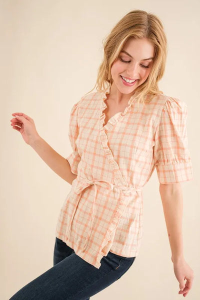 And The Why Plaid Patterned and Ruffled Wrap Blouse Top