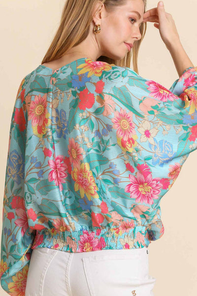 Umgee USA Full Size Floral Print Smocked Back Hem V-Neck Blouse