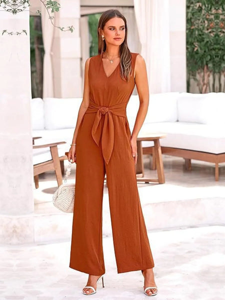 V-Neck Sleeveless Wide-Leg Jumpsuit with Waist Tie