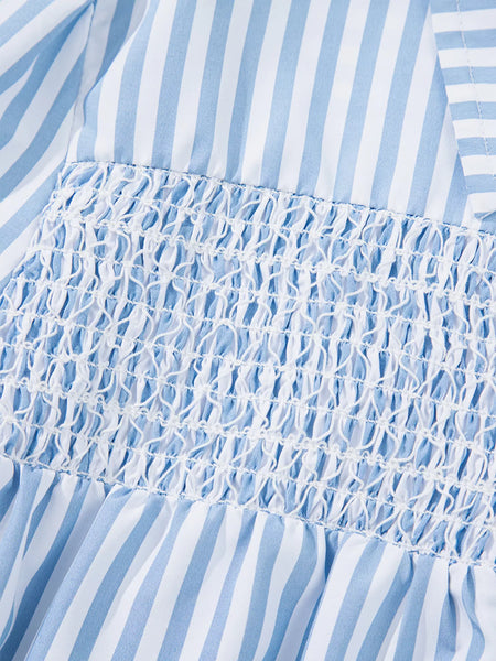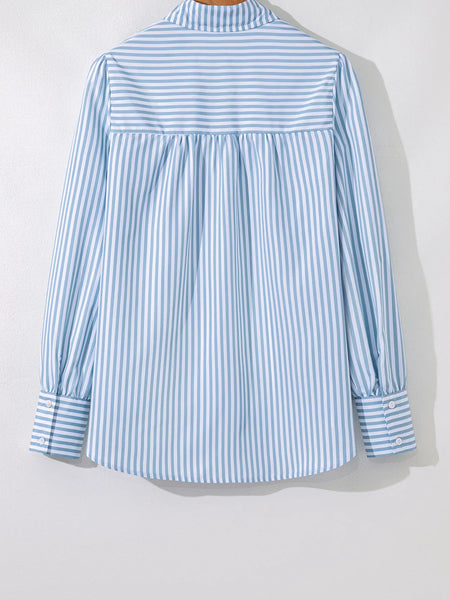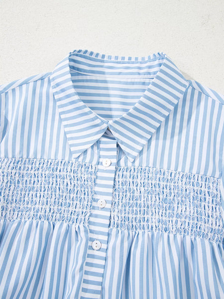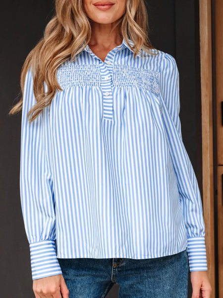 Stripe Shirred Detail Half Placket Collared Long Sleeve Shirt