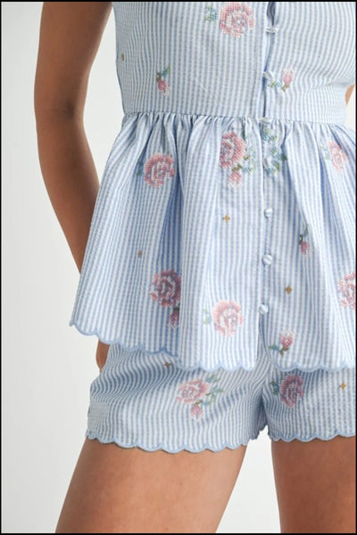 This charming set includes a stripe embroidered peplum cami and matching shorts. The cami features delicate embroidery for a touch of elegance, while the peplum design adds a flattering silhouette. Paired with the coordinating shorts, this set is perfect for a summery and stylish look for various occasions.