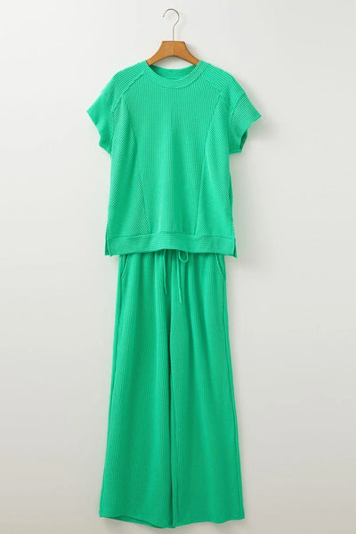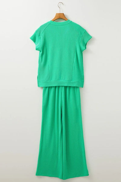 Ribbed Knit Round Neck Top and Pants Casual Set